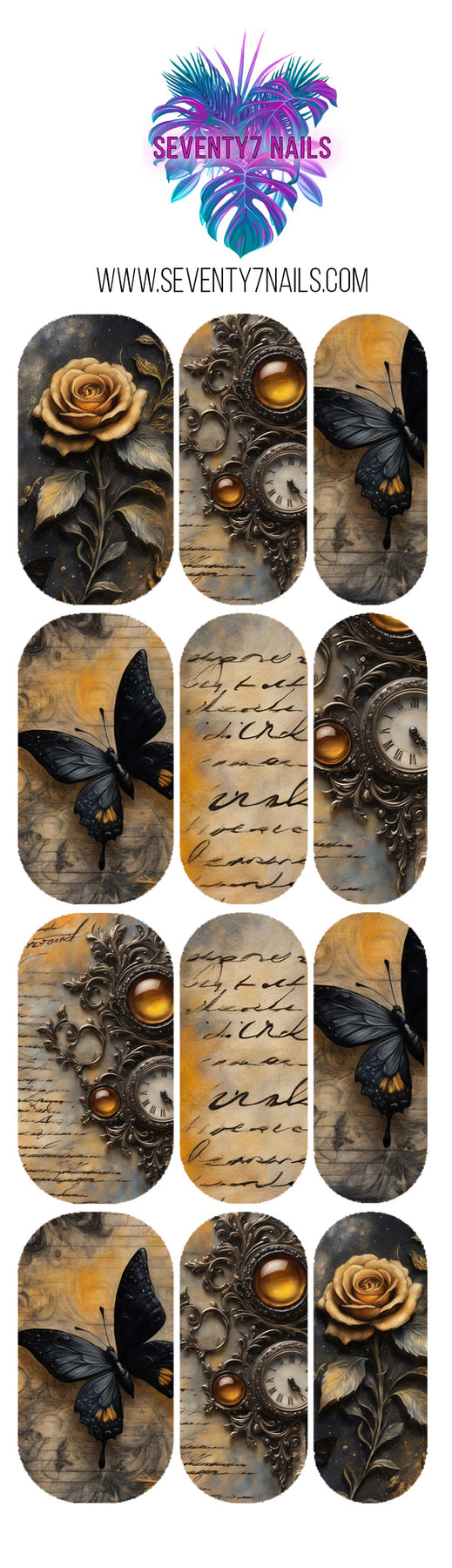 Transform your nails in minutes with our goth waterslide nail decals, designed for easy, flawless application! Whether you're a beginner or a nail art pro, Seventy7 Nails has you covered with stunning, intricate designs that make salon-quality nails accessible from the comfort of your home. Also nail decals are perfect for nail techs whose clients are in a rush but want detailed art!